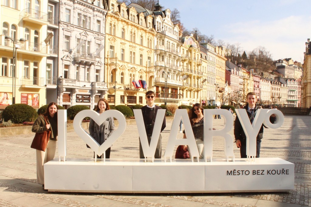 Em minha última segunda feira na República Tcheca, aproveitamos o p-day para um desvio da familiar Namesti Republiky. Eu, Sister Evans, Sister Yost, Élder Liddicott e Élder Walker fomos para Karlovy-Vary, uma pequena cidade a pouco menos de 2 horas de distância de Plzeň, conhecida pelas suas fontes termais e canecas divertidas.